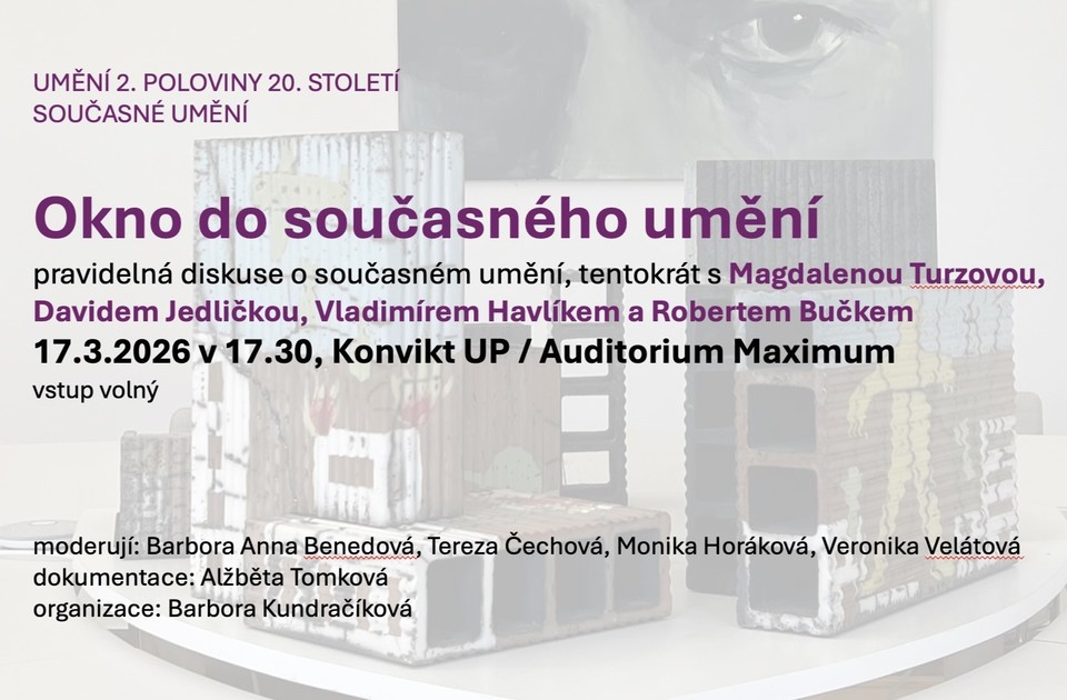 První z cyklu diskusí věnovaných současnému umění, které moderují studenti Katedry dějin umění FF UP, proběhne v úterý 17.3. od 17.30 v Auditoriu Maximu. Pozvání přijali malíři Magdalena Turzová a David Jedlička, performer Vladimír Havlík a sochař Robert Buček, kteří v Olomouci dlouhodobě působící také pedagogicky. Diskuse navazuje na projekt Umění v novém světě.