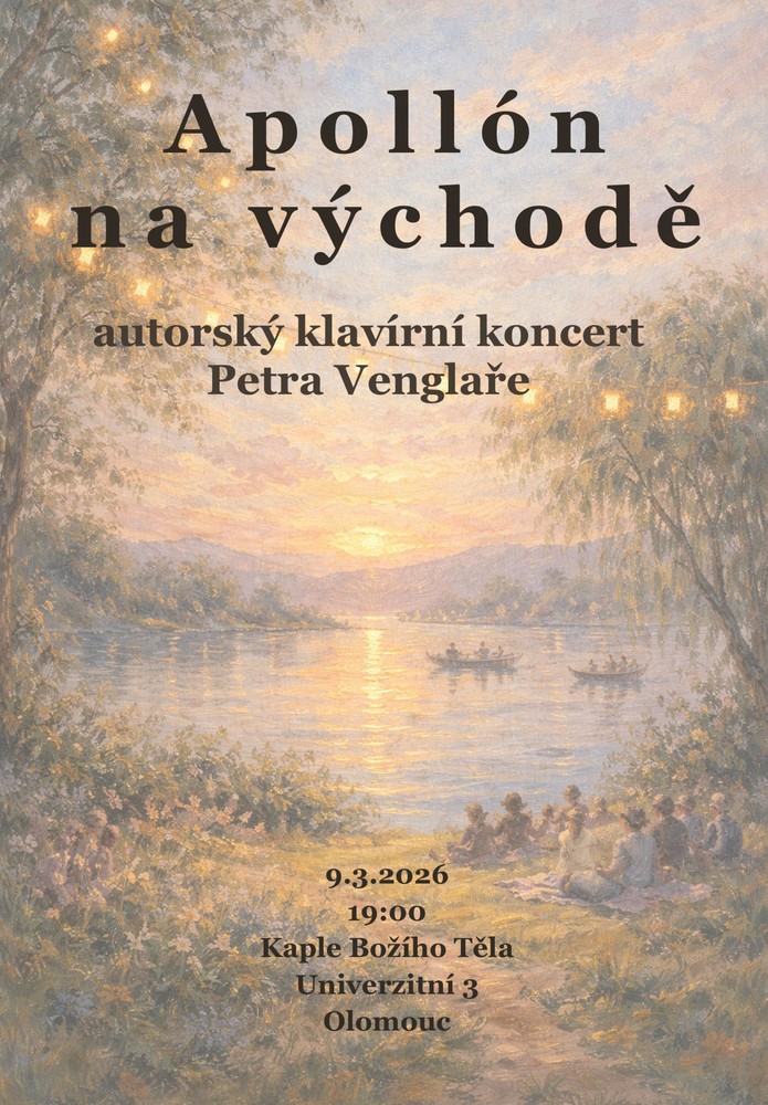 Autorský koncert, na kterém zazní klavírní skladby od současného olomouckého skladatele a spisovatele Petra Venglaře (student doktorského studia na katedře muzikologie FF). Můžete se těšit na kompozice ve stylu francouzského romantismu, impresionismu a neoklasicismu.