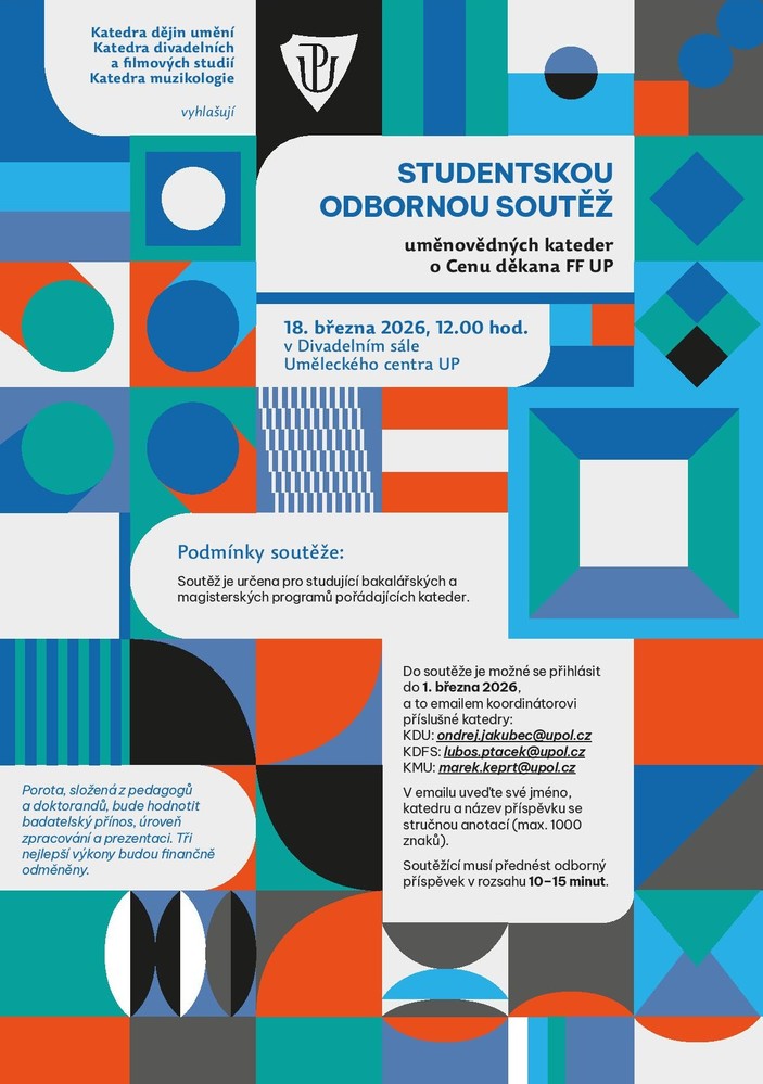 Zveme Vás na studentskou odbornou soutěž uměnovedných kateder, která se uskuteční 18. března 2026 ve 12:00 v Divadelním sále Uměleckého centra UP.